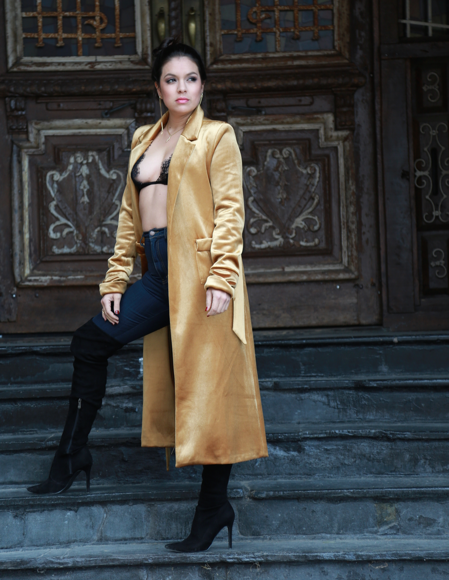 This piece is incredibly elegant. The soft gold velvet has a beautiful sheen that will light up any space you walk through. Features a Napoleon collar and wide lapel. Fully lined this velvet statement piece is heavy and very warm. Front pockets and belted closure give this coat a chic polished finish. We styled ours with dark denim and knee high black boots. Timeless and chic this coat will last you season upon season.